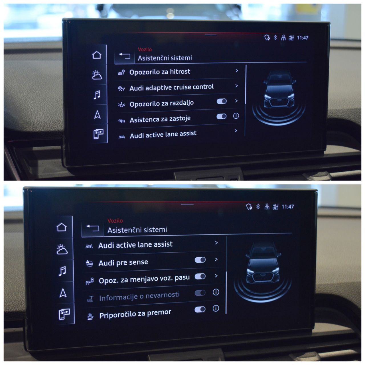 - Asistenčni sistemi: Audi pre sense - preprečevanje naleta vozila, ACC - adaptivni tempomat, Prepoznavanje prometnih znakov, Asistenca za zastoje, Audi active lane assist – ohranjanje vozila na voznem pasu, Opozorilo za menjavo pasu – opozarjanje na vozila v mrtvem kotu, Audi cross traffic assist rear – zaznavanje prečnega prometa pri vzvratni vožnji